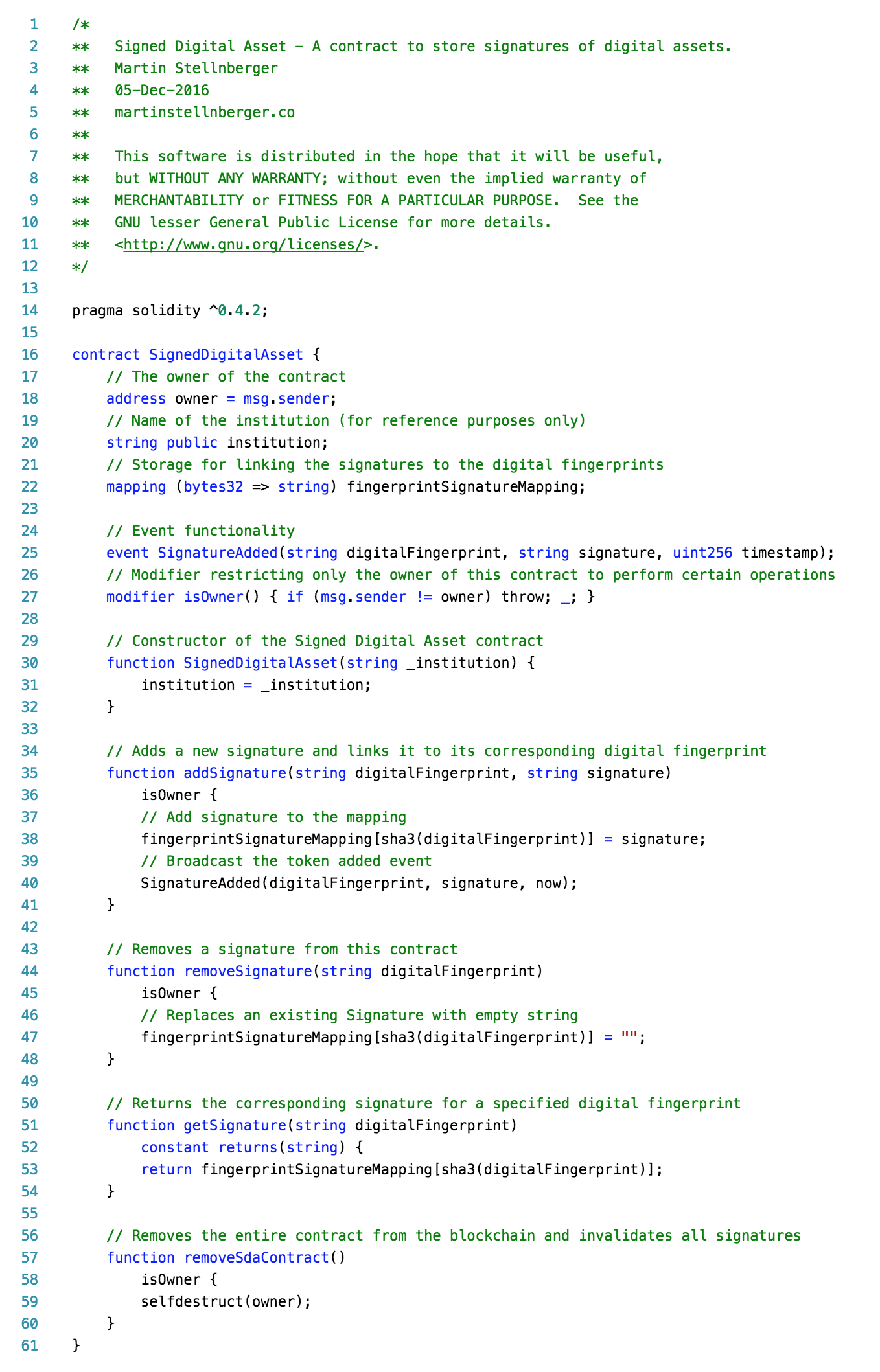 Using this code, an institution can deploy its own contract on the Blockchain. This contract now serves the role of an immutable storage container for all the institution’s digital asset signatures.